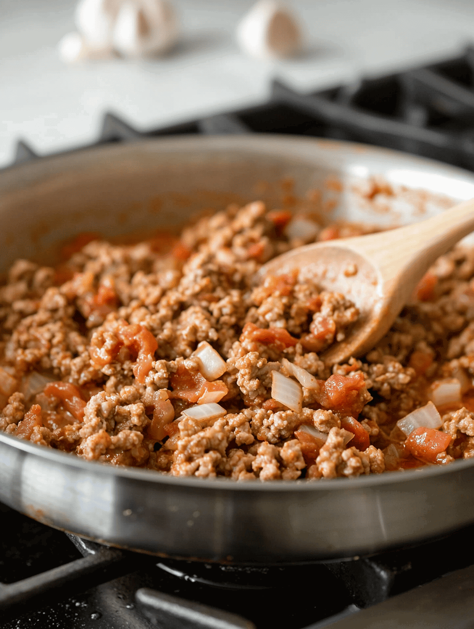 - Add the ground turkey to the pot, breaking it apart with your spoon. Cook until fully browned and no pink remains, about 7-10 minutes. The mixture should be starting to thicken and lose any excess moisture.
