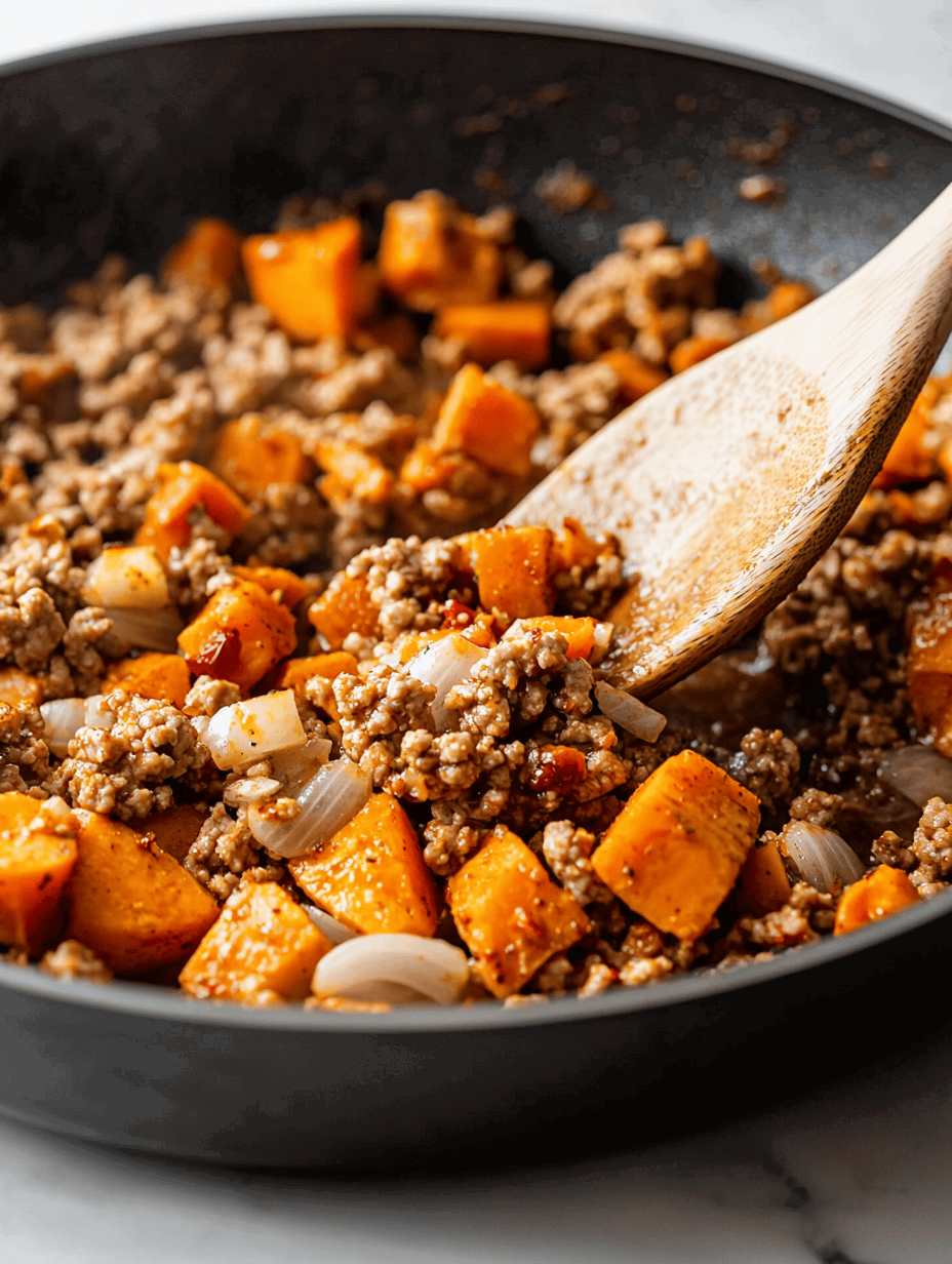 - Stir in the roasted garlic and cook for another minute until fragrant. Add chili powder, cumin, and smoked paprika, stirring to coat the meat and sweet potatoes evenly. Aromas of spices should start to bloom, filling your kitchen with warmth.