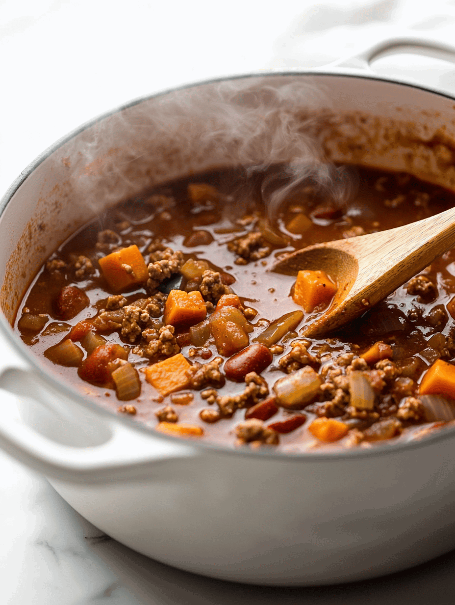 - Reduce the heat to low and let the chili simmer uncovered for about 25-30 minutes, stirring occasionally. During this time, the sweet potatoes will soften further, and the flavors will meld into a hearty, fragrant stew with a rich, slightly thickened broth.