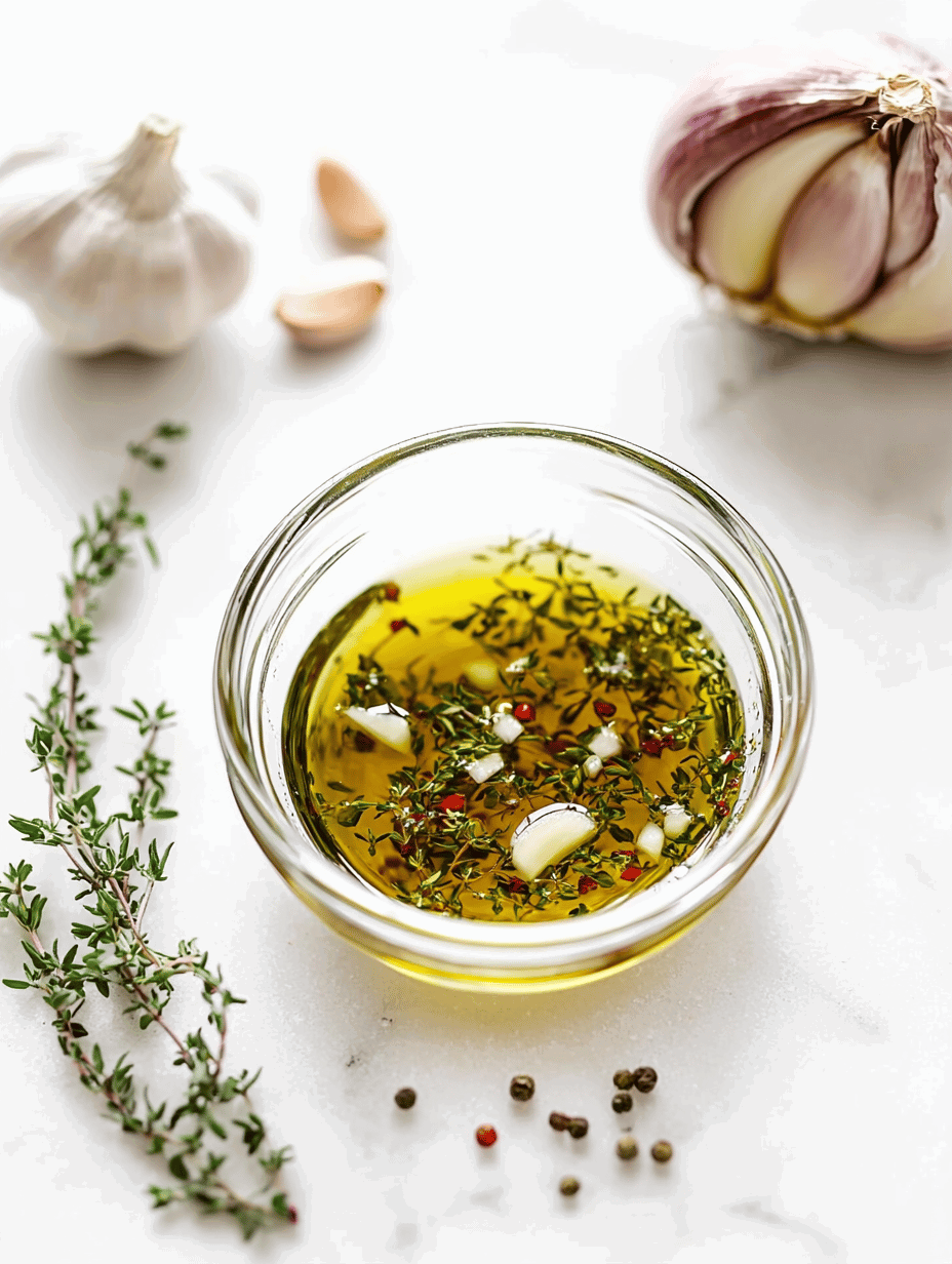 • In a small bowl, mix a tablespoon of olive oil with the minced garlic and remaining thyme. Set aside this flavorful oil mixture for later use.