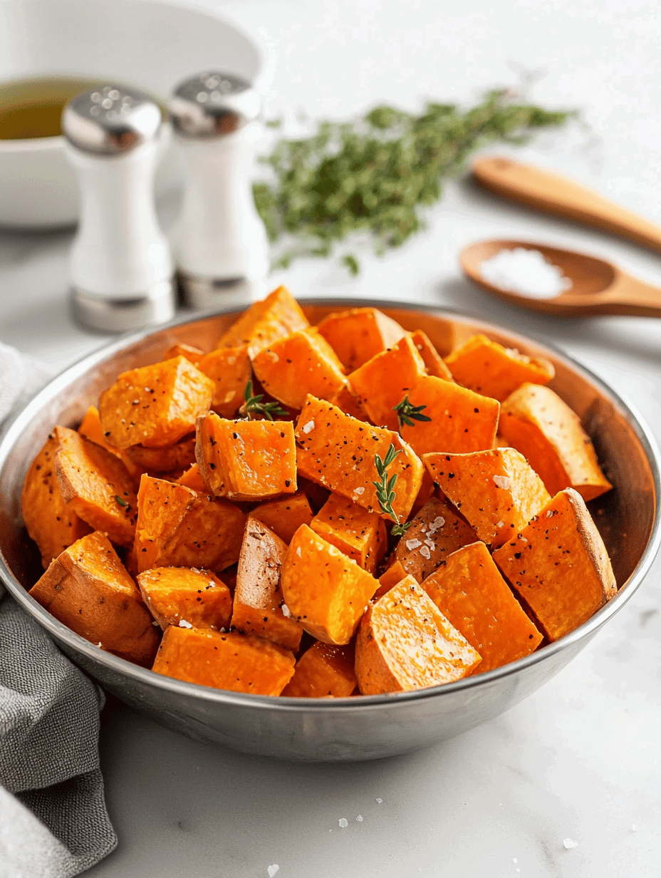 • Toss the sweet potato chunks with a tablespoon of olive oil, salt, pepper, and an extra sprinkle of thyme until they are well coated.