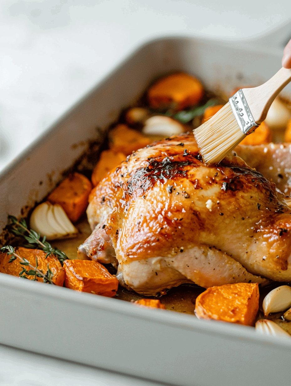• Halfway through, baste the chicken with juices from the pan to keep it moist and crispy. If the sweet potatoes are browning too quickly, cover loosely with foil for even cooking.