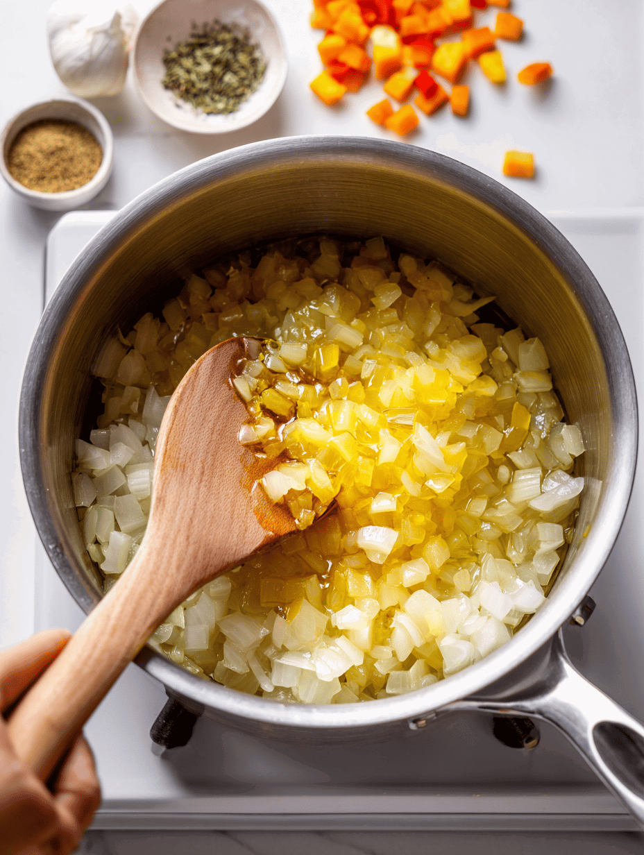 • Heat the large pot over medium heat and add a splash of oil. When shimmering, add the diced onions and cook until translucent, about 5 minutes, until they turn sweet and fragrant.