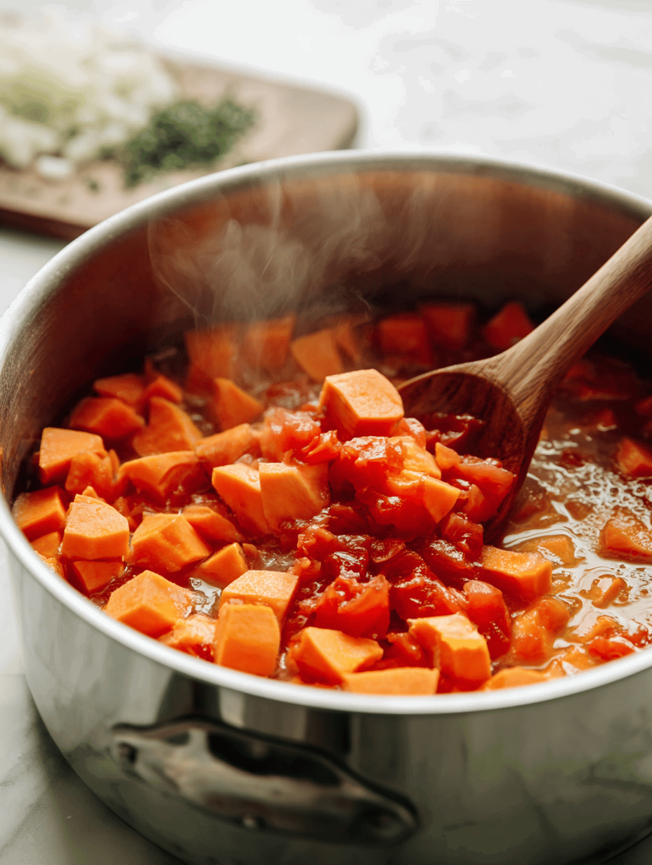 4. Reduce heat to low, cover, and simmer gently for 40 minutes. Check occasionally, stirring to prevent sticking. The sweet potatoes should be tender and the chili thickened. If it’s too thick, splash in a bit more broth; too thin, uncover and simmer a bit longer.