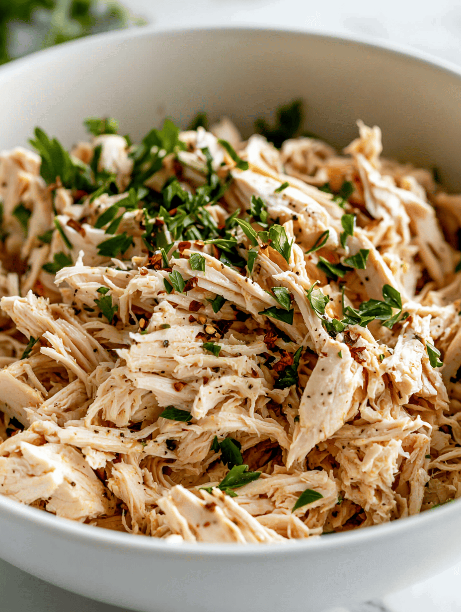 - In a large mixing bowl, combine the shredded cooked chicken with chopped herbs, a pinch of salt, and pepper. Toss gently to distribute the herbs evenly throughout the chicken.