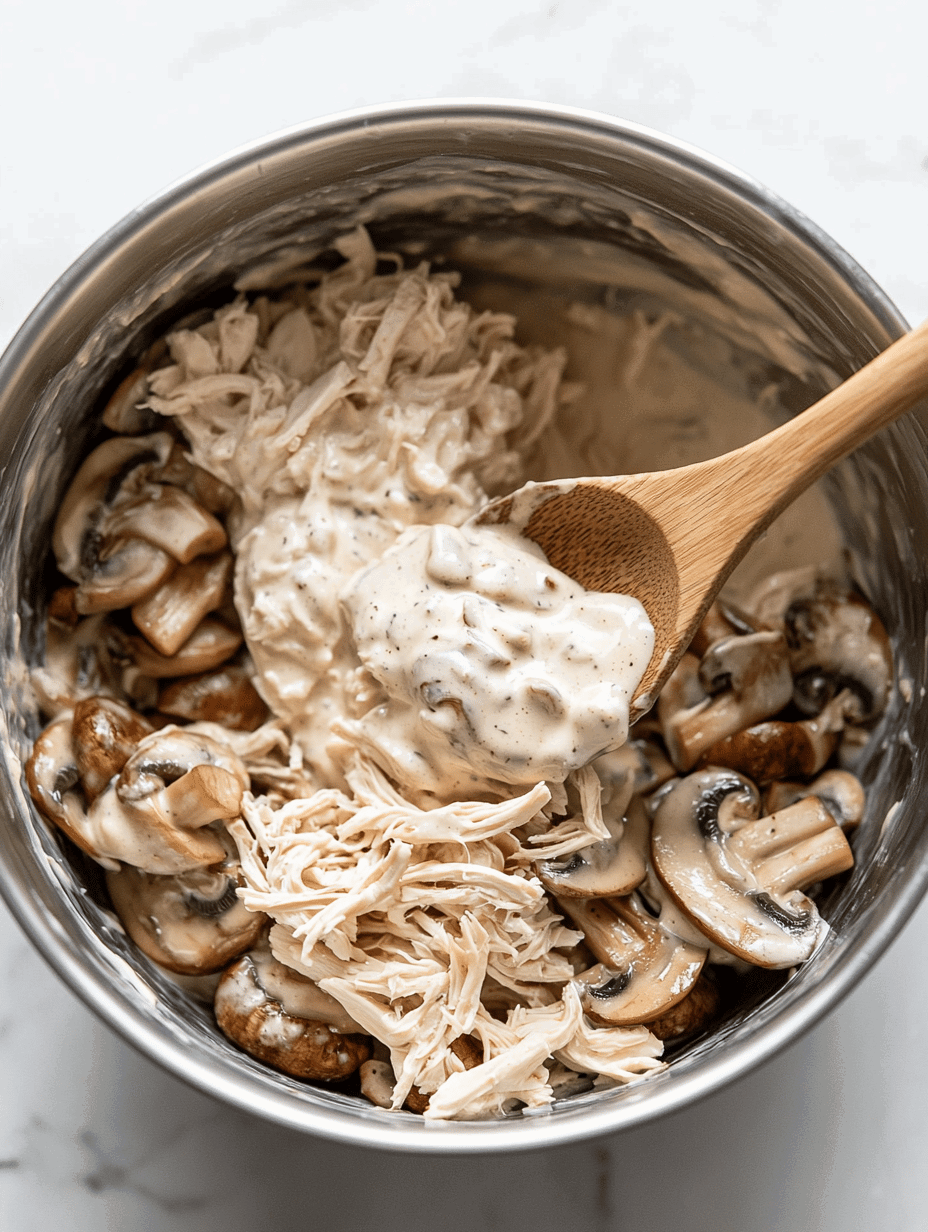 - Stir in the cream of mushroom soup until the mixture is smooth and well combined. This creates a creamy coating that will keep the chicken moist during baking.