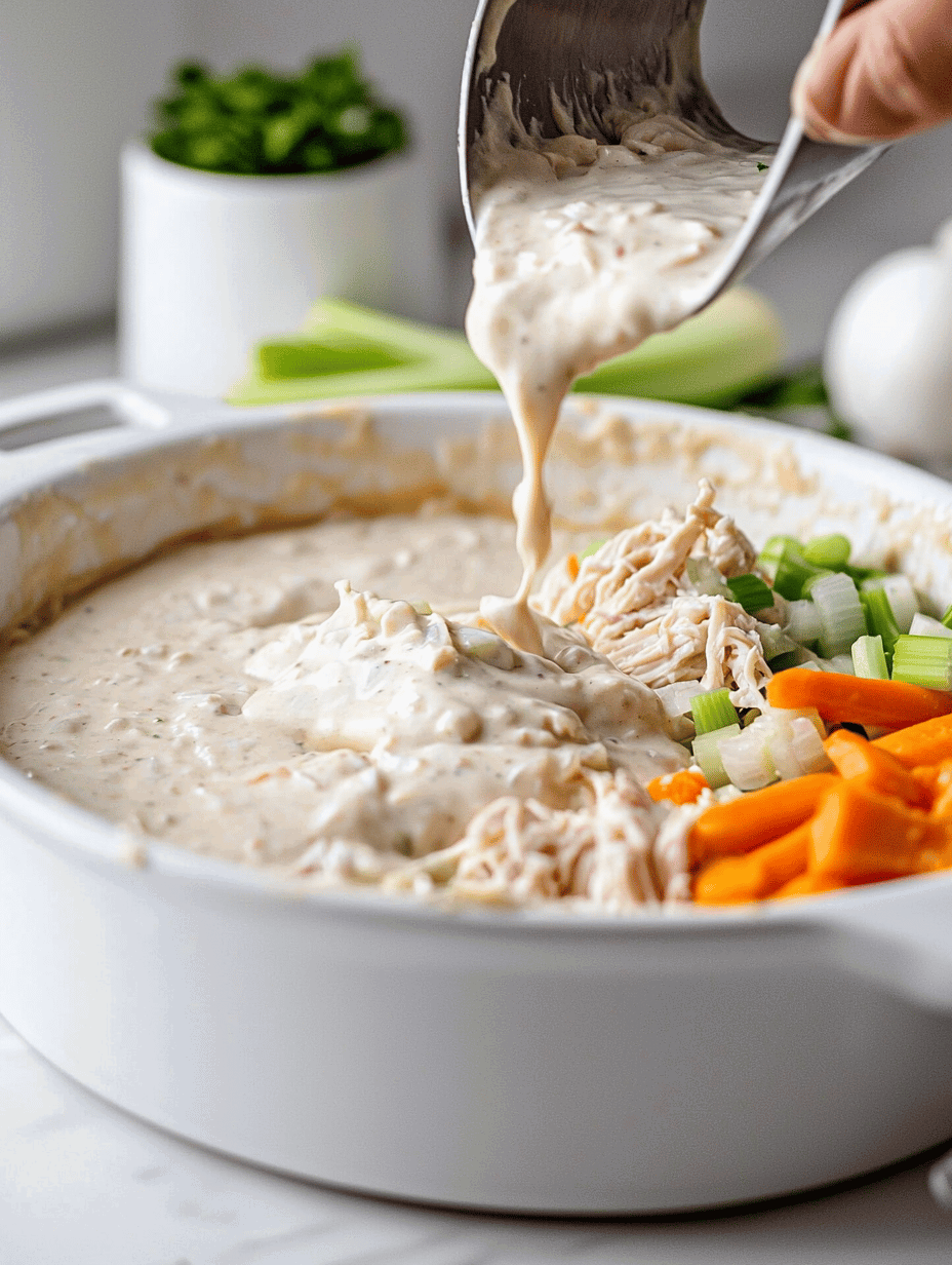 - Pour the chicken mixture into the prepared baking dish, spreading it out evenly with a spatula or spoon. The layer should be smooth and slightly bubbly around the edges.