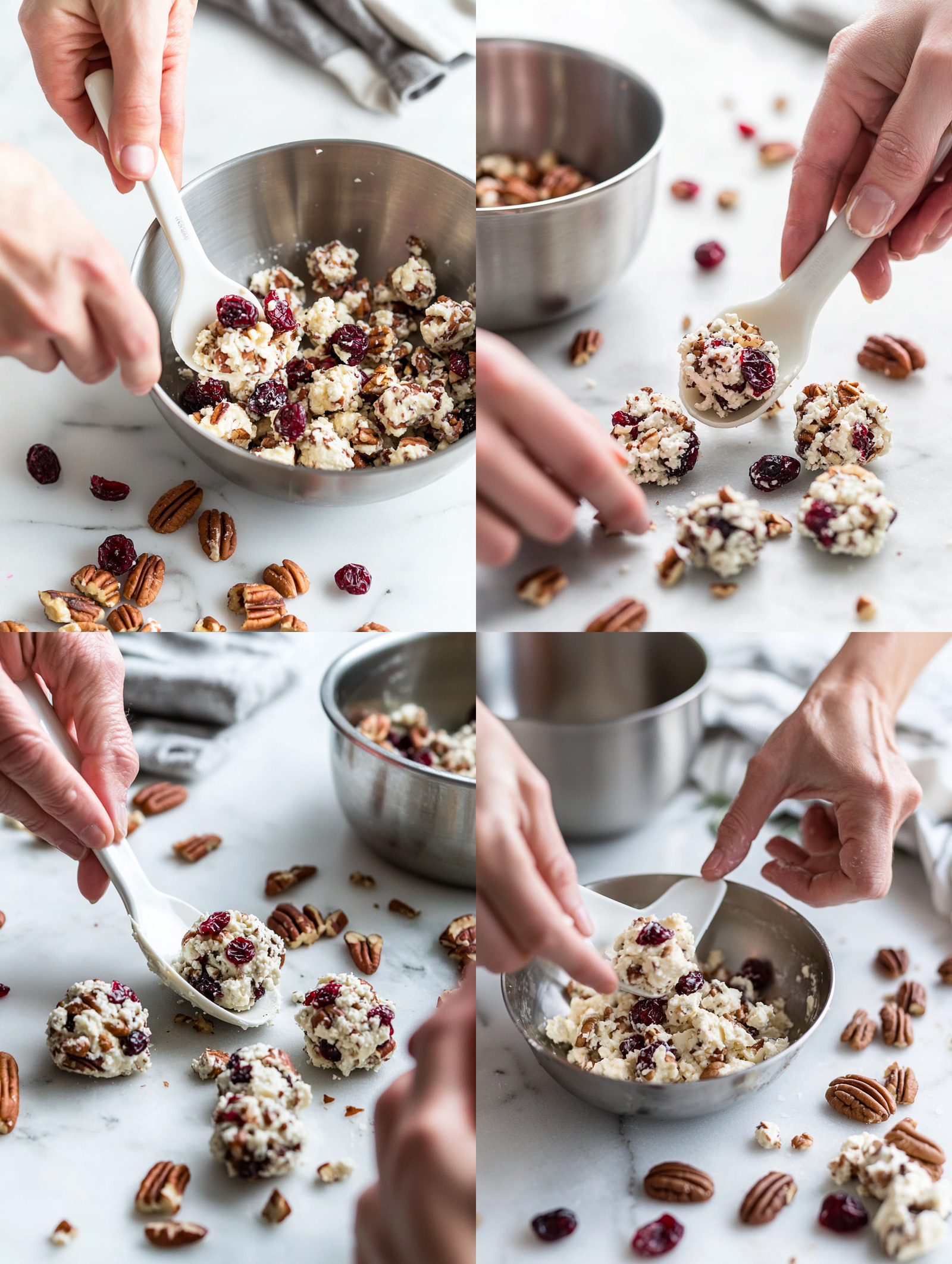 • Once the mixture is cohesive and slightly sticky, scoop out about a tablespoon at a time and roll between your palms to form small, round balls.