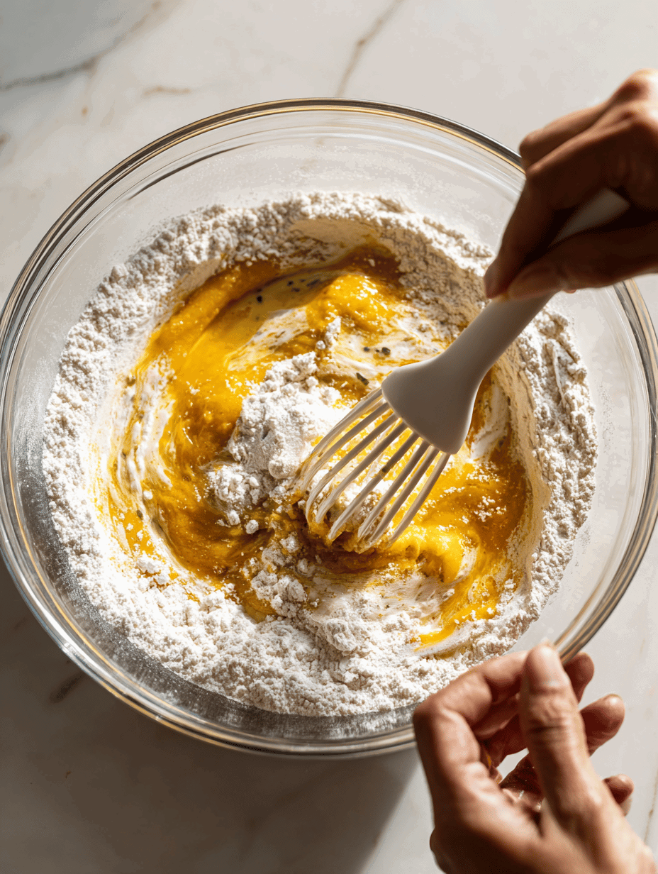 - In a large mixing bowl, whisk together the flour, cinnamon, nutmeg, ginger, baking powder, and salt until evenly combined. This creates a fragrant, evenly mixed dry base.