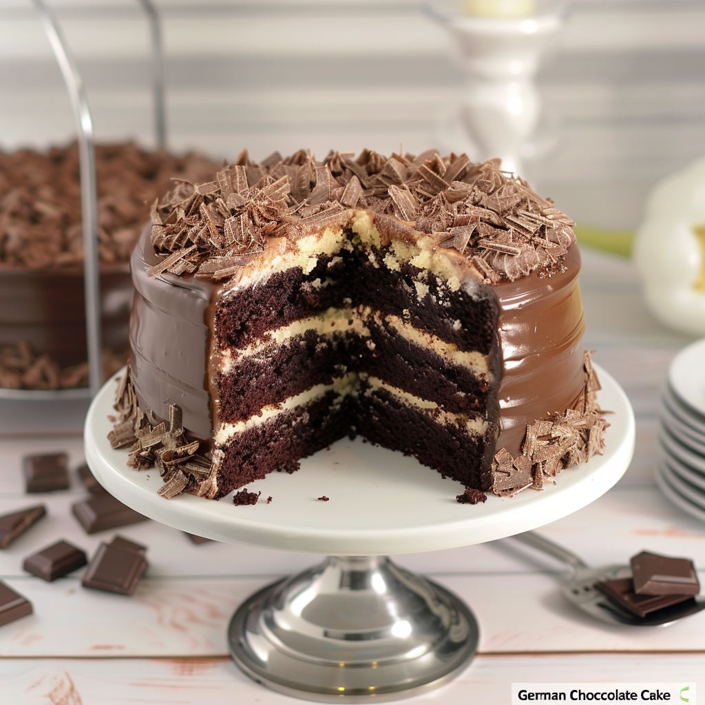 The rich and decadent delight of German Chocolate Cake. Known for its moist chocolate layers, velvety coconut-pecan filling, and luxurious chocolate ganache, this classic dessert is a true symbol of indulgence.