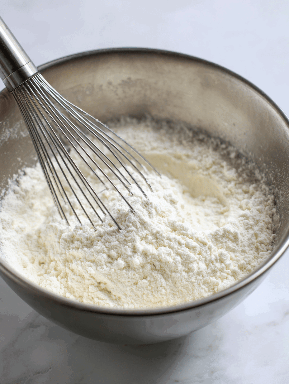 - In a large mixing bowl, whisk together the flour, sugar, and baking powder until evenly combined, creating a light, fluffy base.