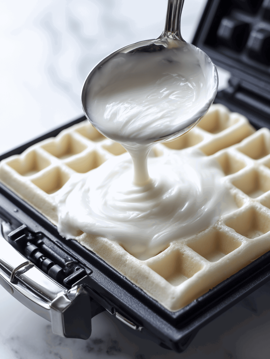 - Pour about half a cup of batter onto the center of the waffle iron, spreading it slightly to cover the grid, creating a ghostly white canvas.