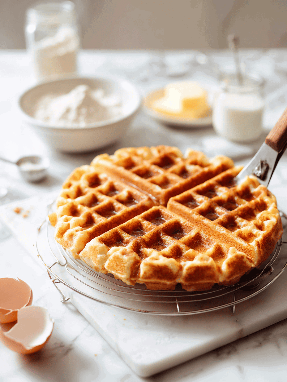 - Place the finished waffle on a cooling rack or plate, and repeat with remaining batter, ensuring each waffle retains its airy, crisp texture.