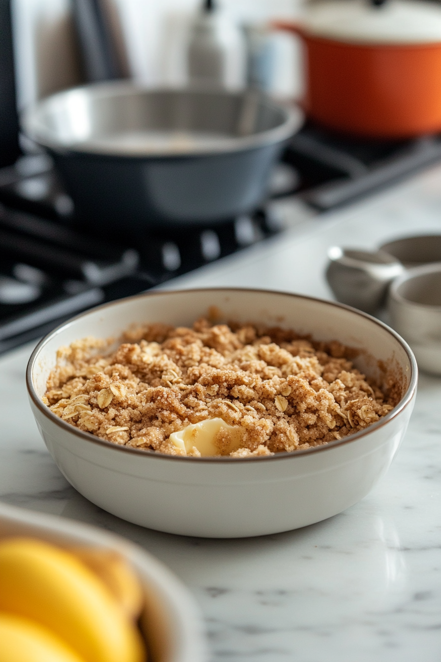 - For the streusel, combine butter, brown sugar, granulated sugar, cinnamon, flour, and oats, mixing until crumbly. Set aside.