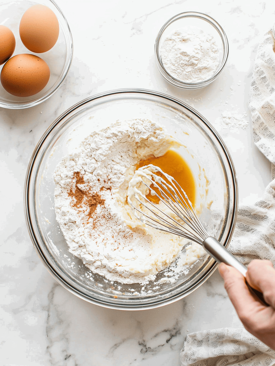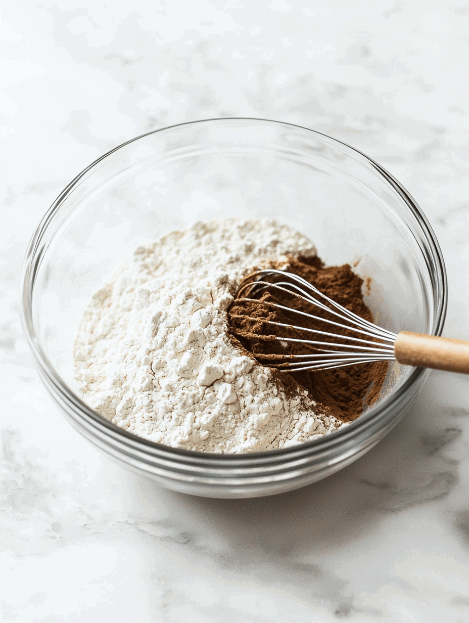 • In a large mixing bowl, whisk together the gluten-free flour, cinnamon, nutmeg, baking soda, and salt until combined. This creates a well-balanced dry mix for the batter.