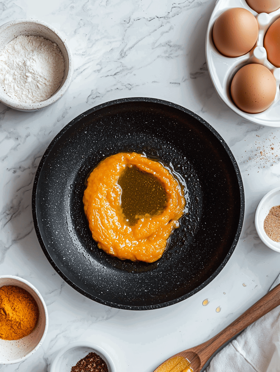 • Add the eggs, mashed pumpkin, almond milk, and maple syrup to the dry mixture. Whisk everything together until the batter is smooth and slightly thick but pourable, with no lumps remaining.