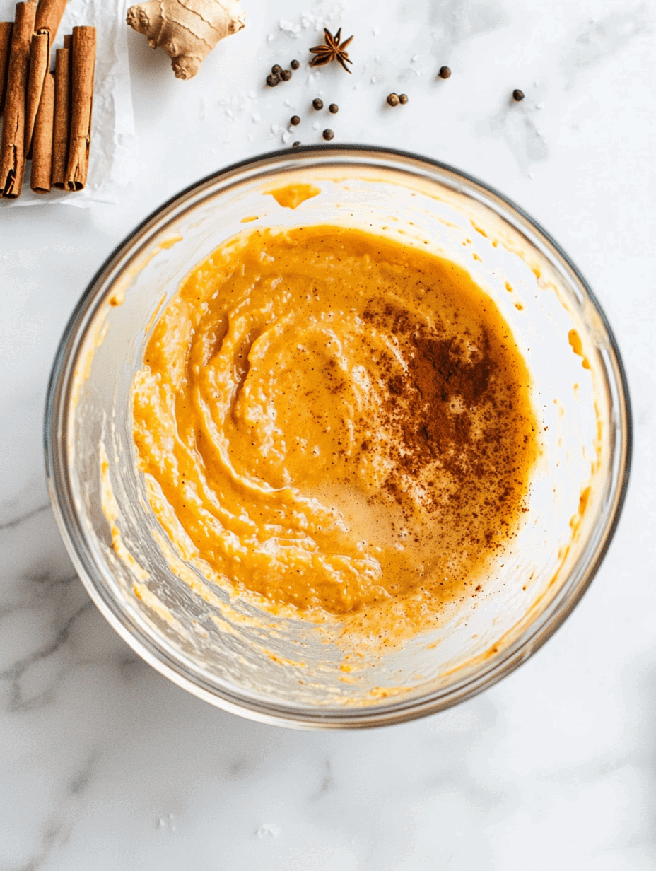 - In a mixing bowl, whisk together the eggs, pumpkin puree, milk, cinnamon, nutmeg, ginger, and a pinch of salt until well combined and smooth.