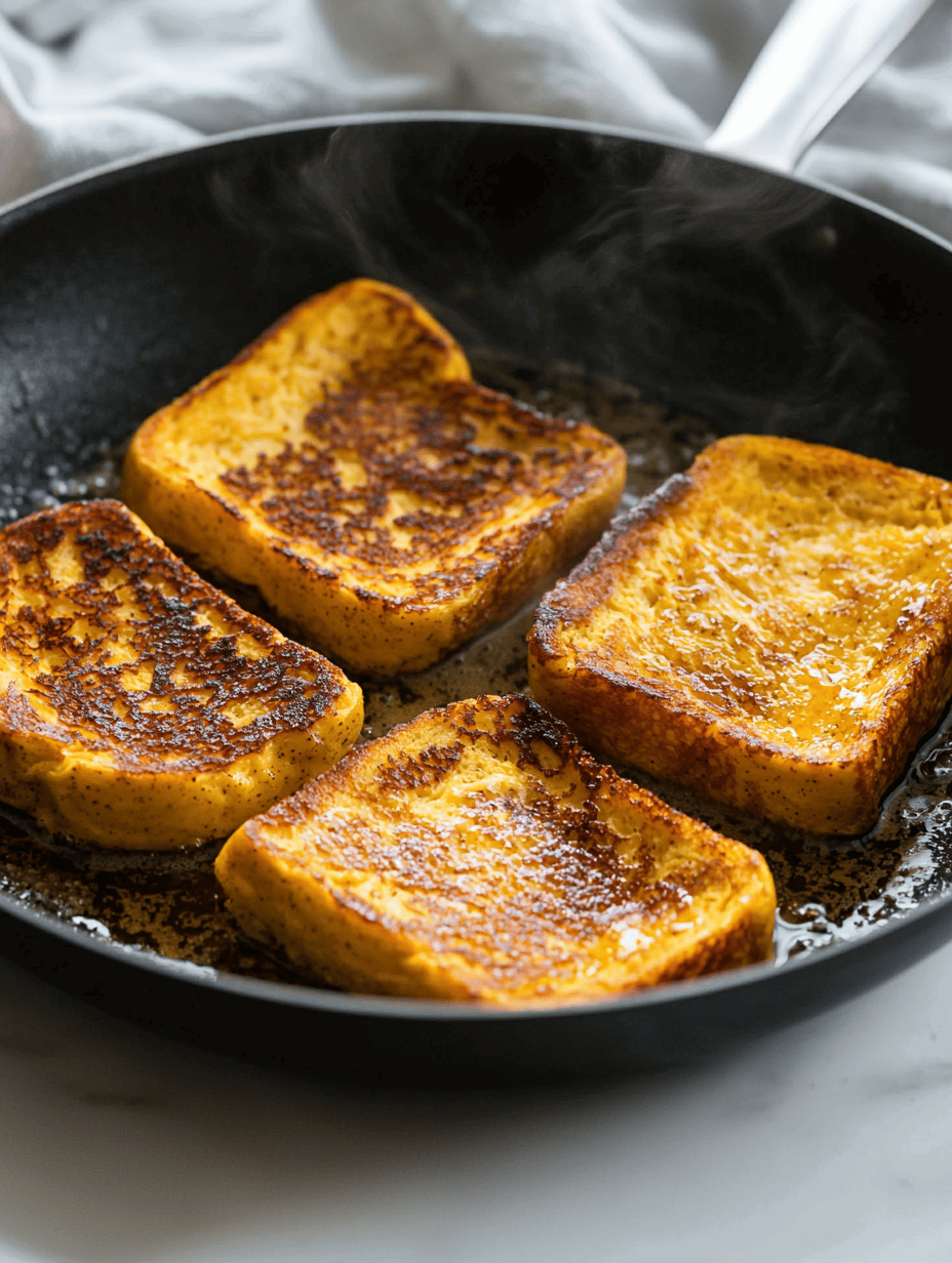 - Place the soaked bread slices in the skillet and cook for 3-4 minutes on each side, until golden brown and caramelized along the edges. Listen for a gentle sizzle and watch for a crispy, browned surface.