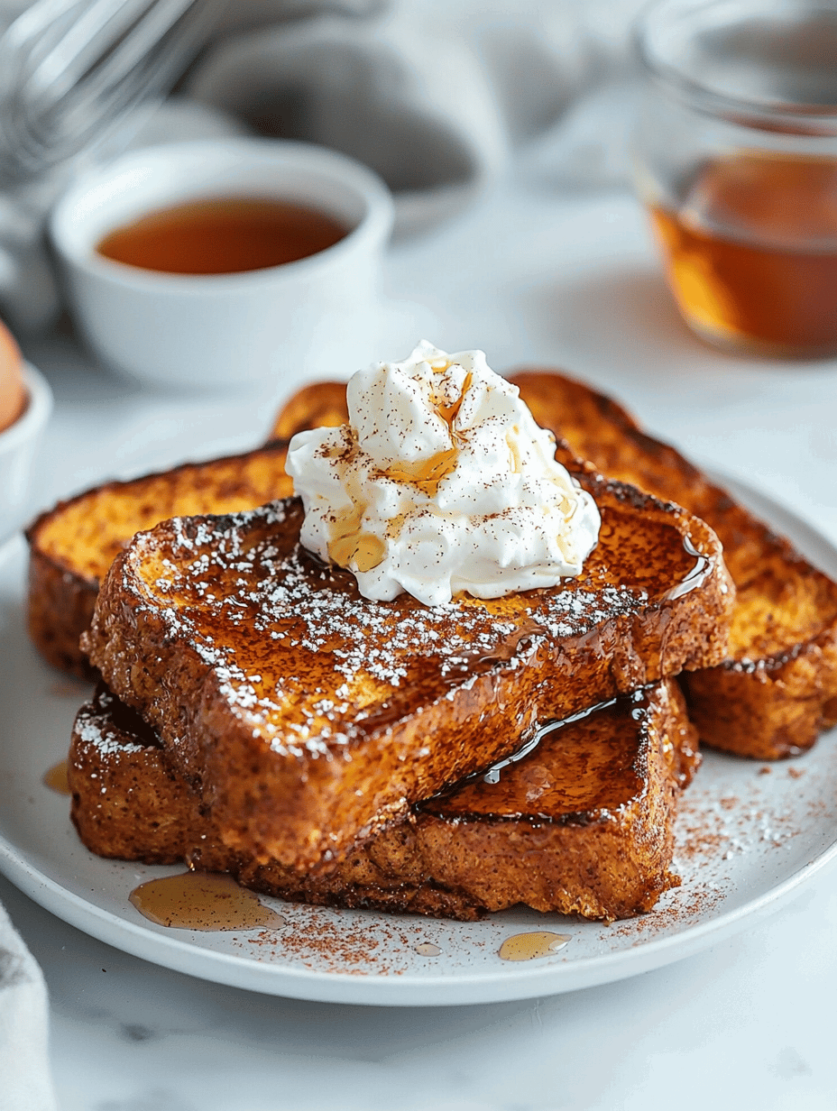 - Once cooked, transfer the French toast slices to a plate and serve immediately, topped with your favorite breakfast accompaniments like maple syrup, whipped cream, or extra cinnamon if desired.