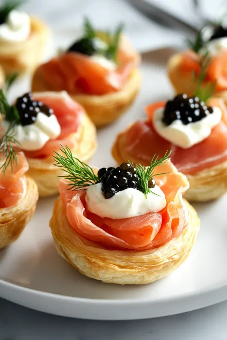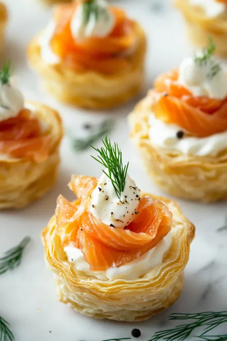 - Fill Each Pastry CupAdd the folded smoked salmon inside each cup, keeping the texture light and airy. The pastry should still be visible around the edges.