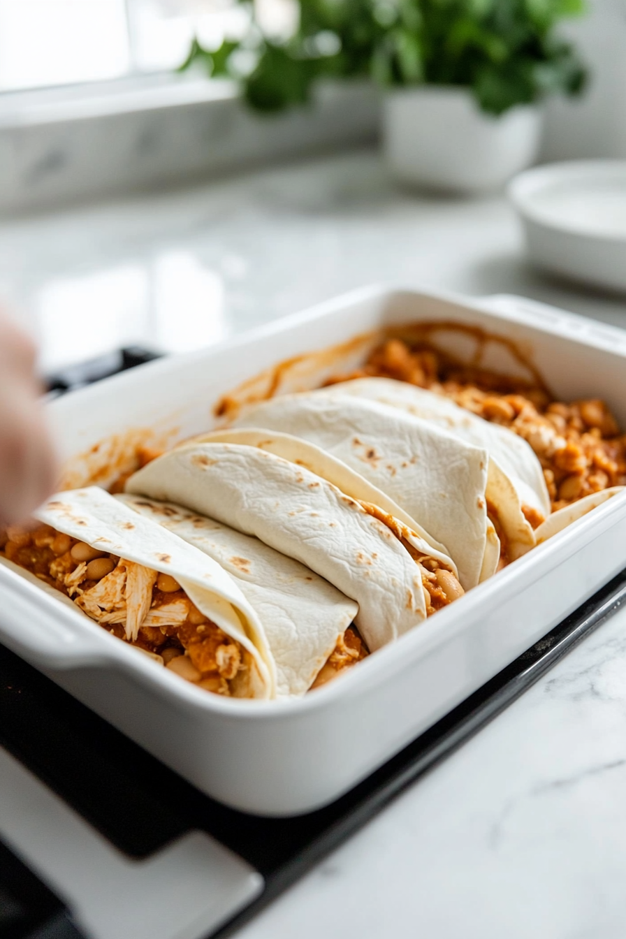 - Spread 1/4 cup of the sauce in the baking dish. Fill tortillas with chicken and bean mixture, then roll and place seam-side down.