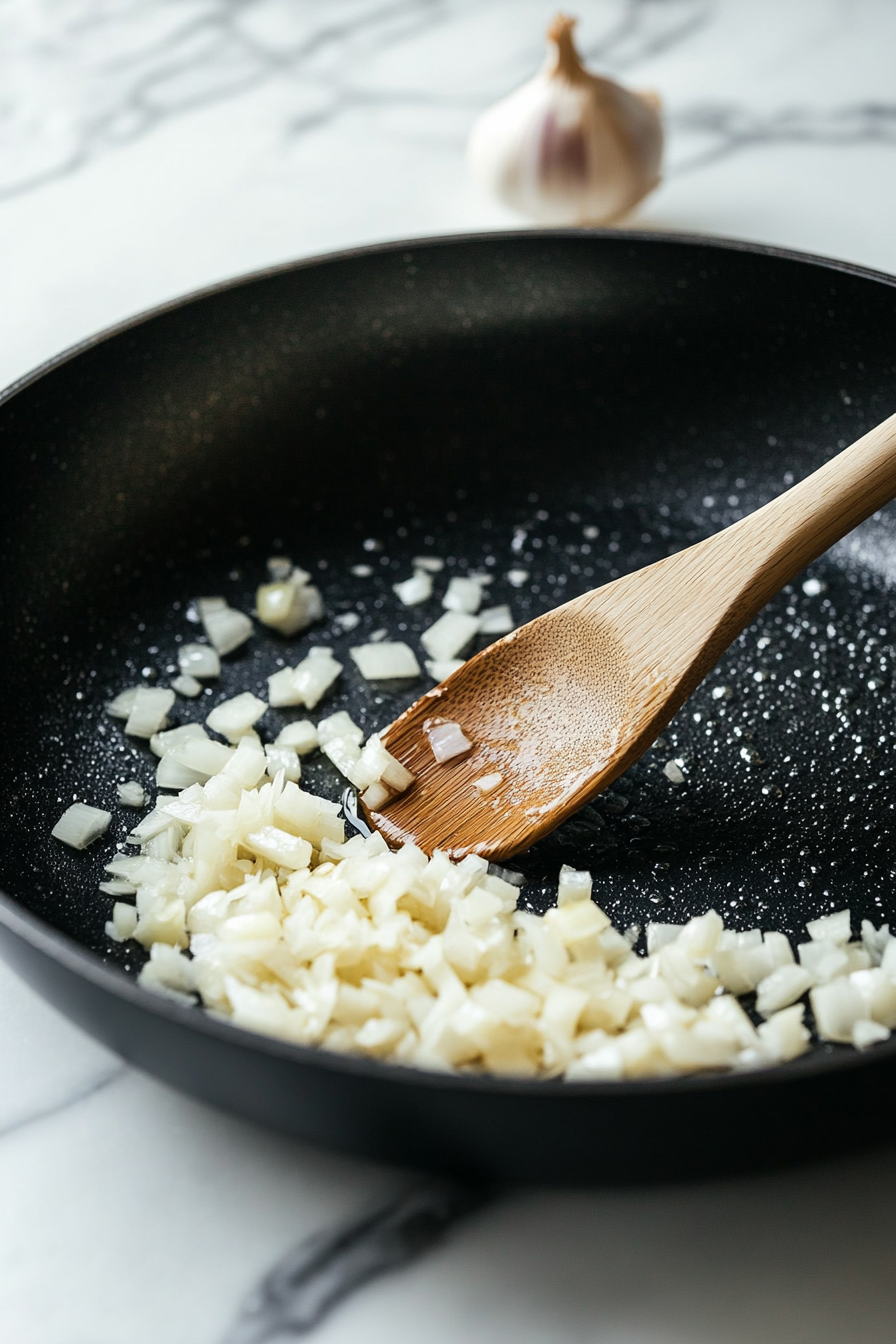 - In a pan, sauté onions and garlic in olive oil until soft, about 2-3 minutes.