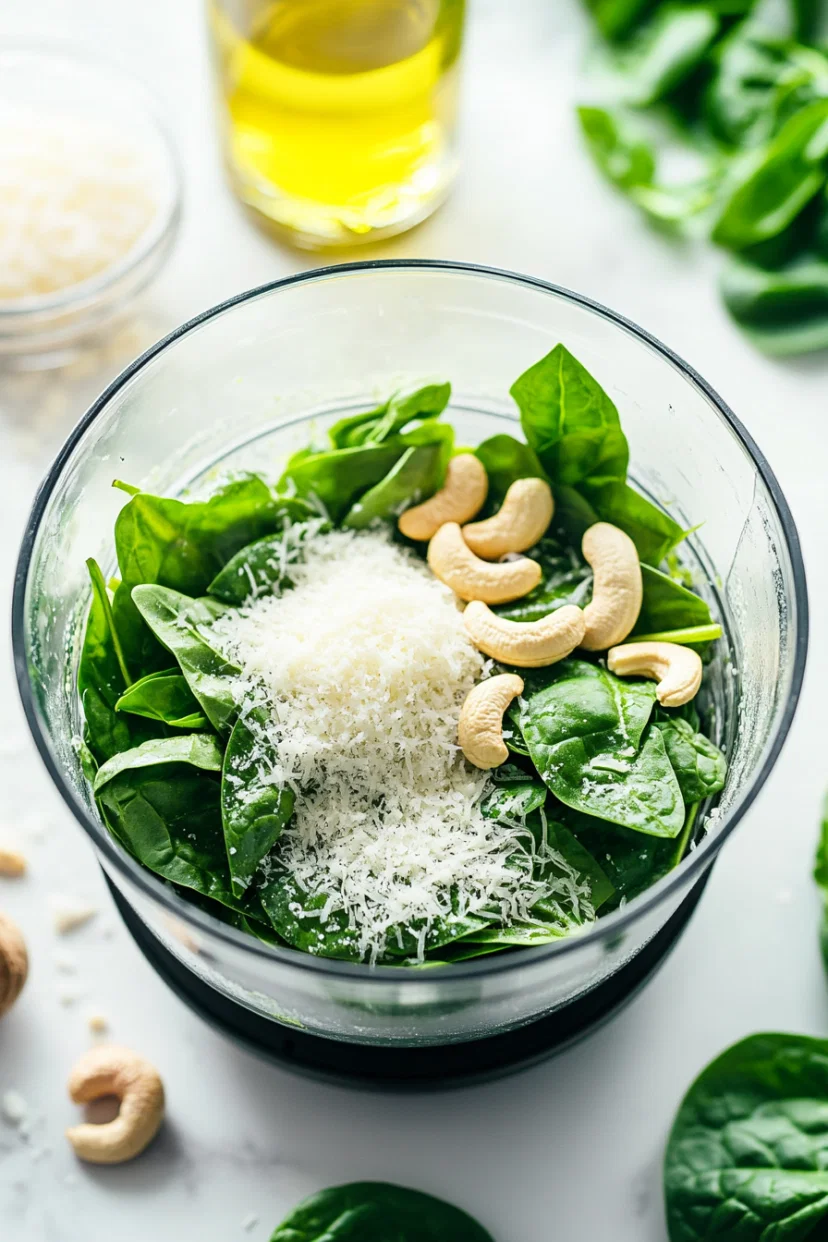 - Add baby spinach, basil, garlic, shallot, lemon juice, olive oil, cashews, parmesan cheese, rice vinegar, and salt to a blender or food processor.