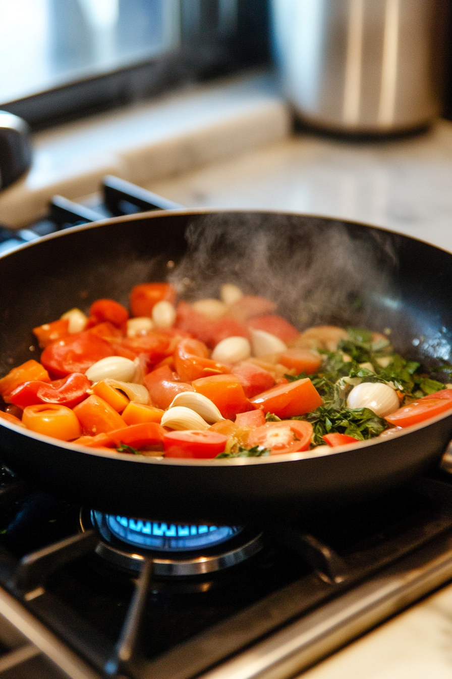 Blending Vegetables with Tomatoes and Seasonings for Sausage Fingers Pasta