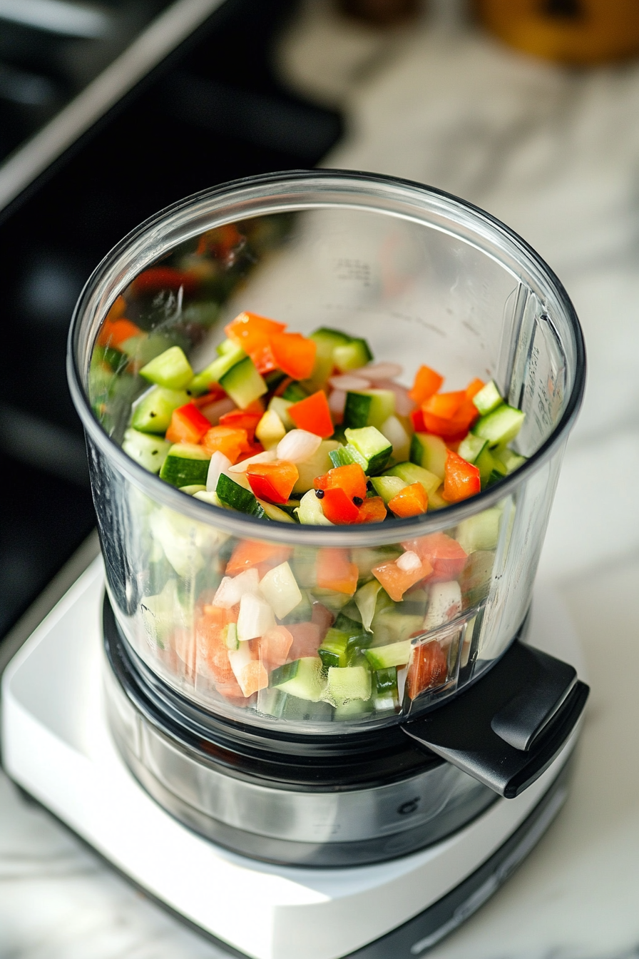 • Transfer the vegetables to a blender, add canned tomatoes, sugar, black pepper, and food coloring (if using), and blend until smooth.