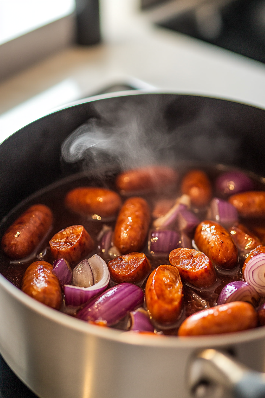 Simmering Sausages and Onions for Sausage Fingers Pasta