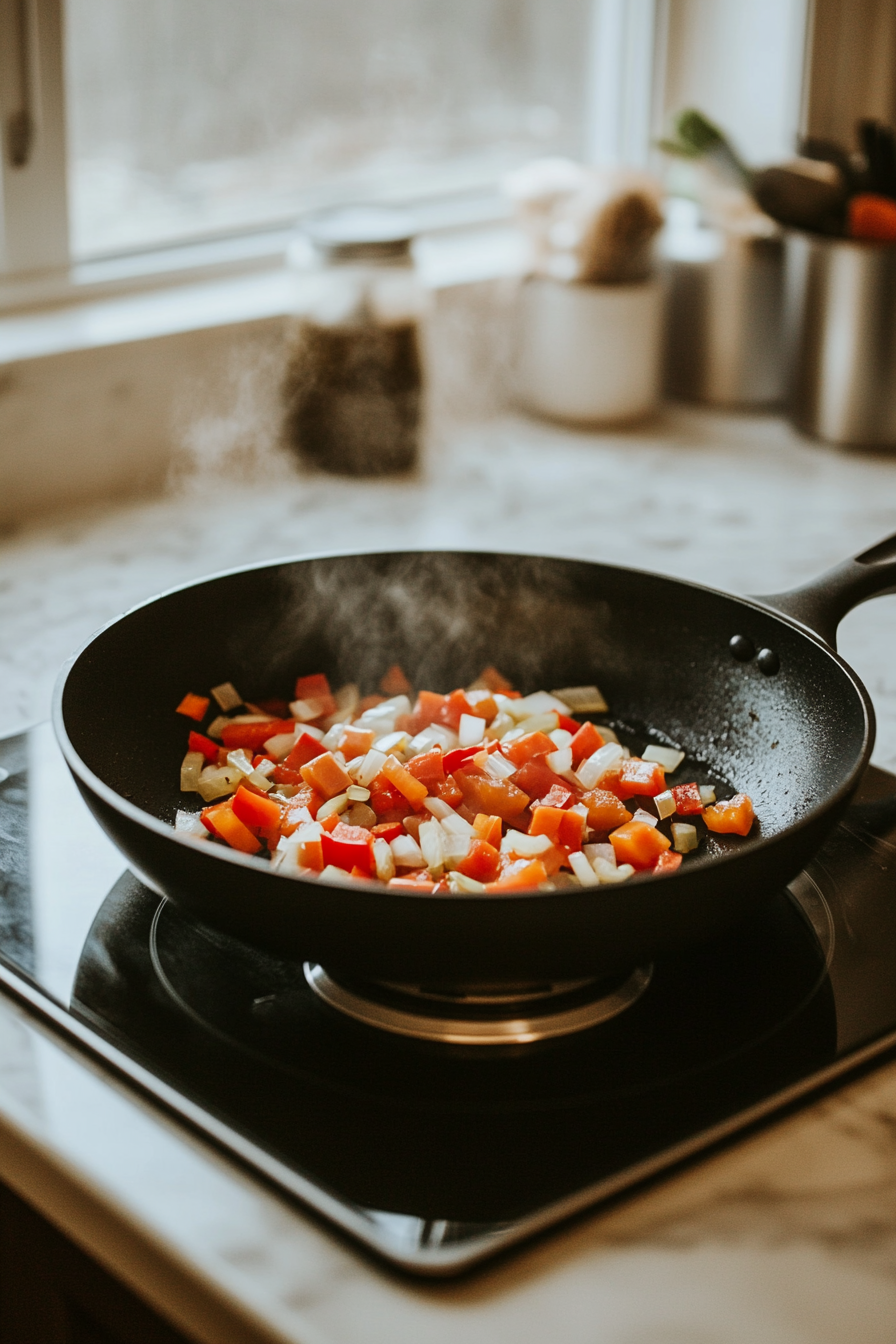 Sautéing Onions, Carrots, and Bell Peppers for Sausage Fingers Pasta Recipe