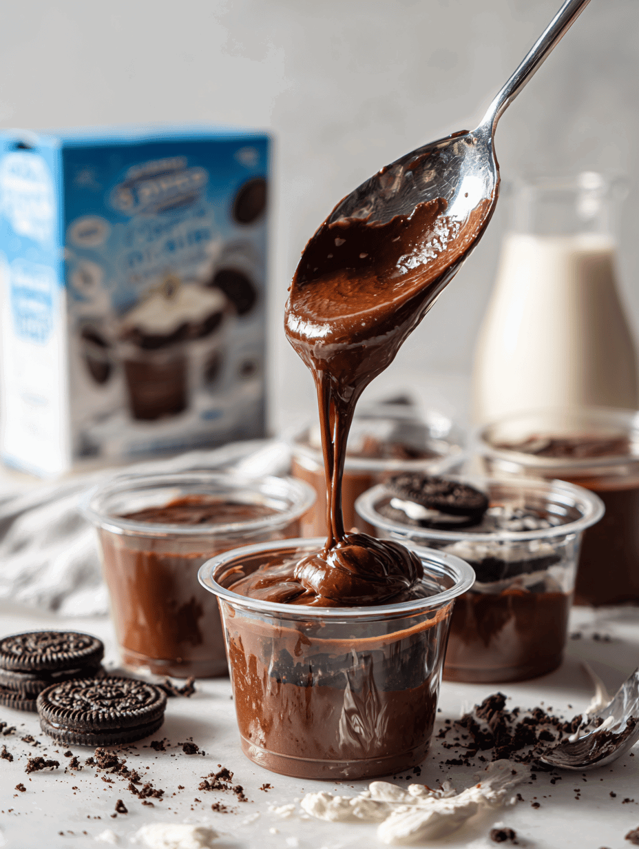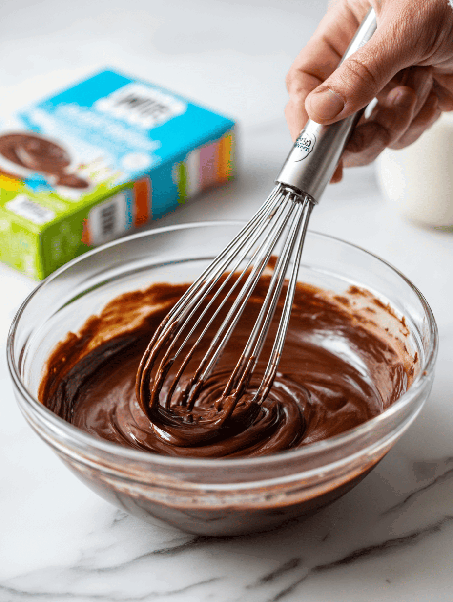 - Mix the chocolate pudding powder with cold milk according to package instructions, then whisk until smooth and set in the fridge to chill for at least 30 minutes.