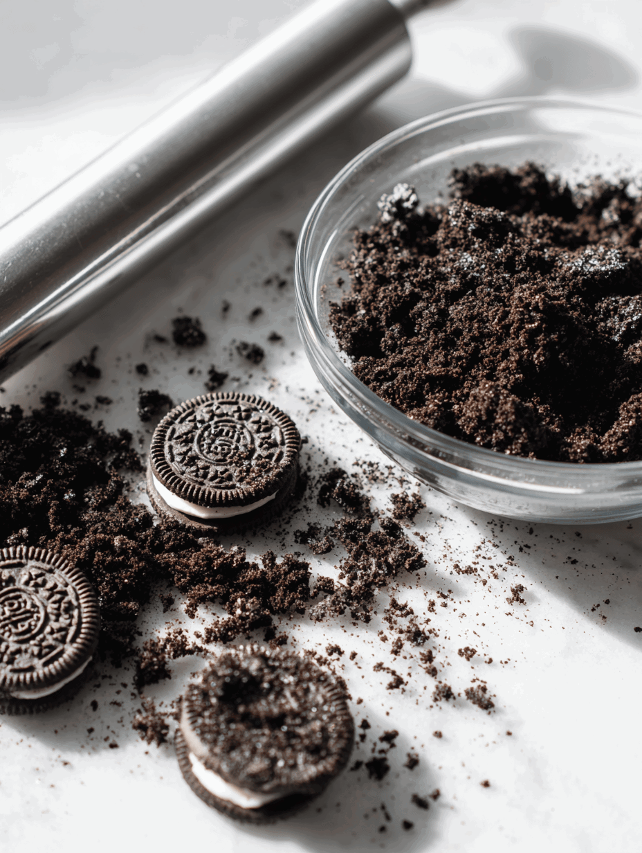 - Crush the Oreos into fine crumbs using a rolling pin or food processor, leaving some bigger pieces for texture.