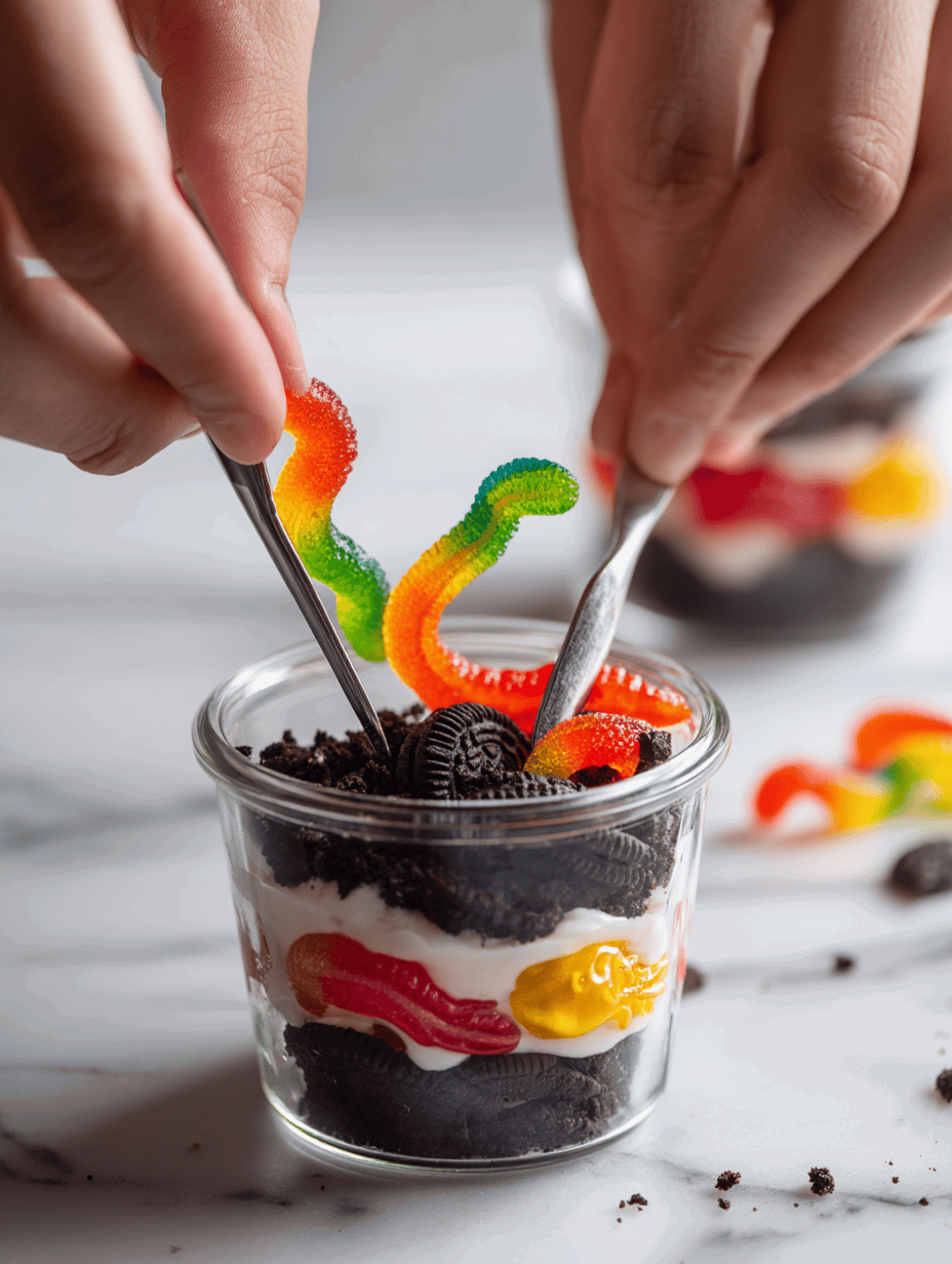 - Place gummy worms and candy skulls on top of the cookie layer, burying some slightly into the crumbs for a realistic effect.