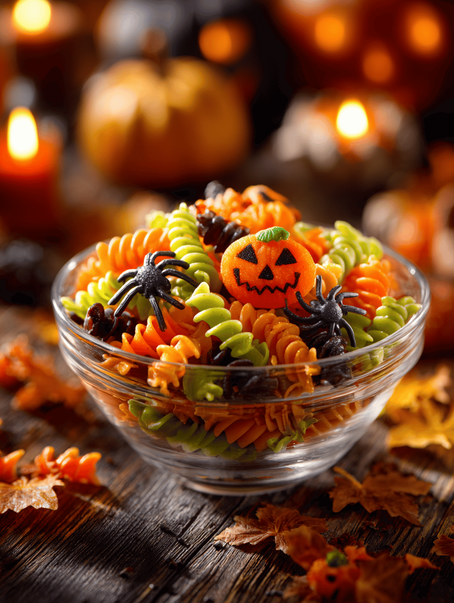 - Pasta: Use short shapes like fusilli or penne — they trap dressing and spooky bits well.