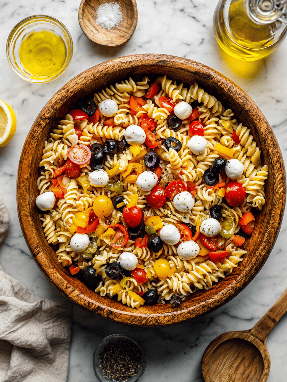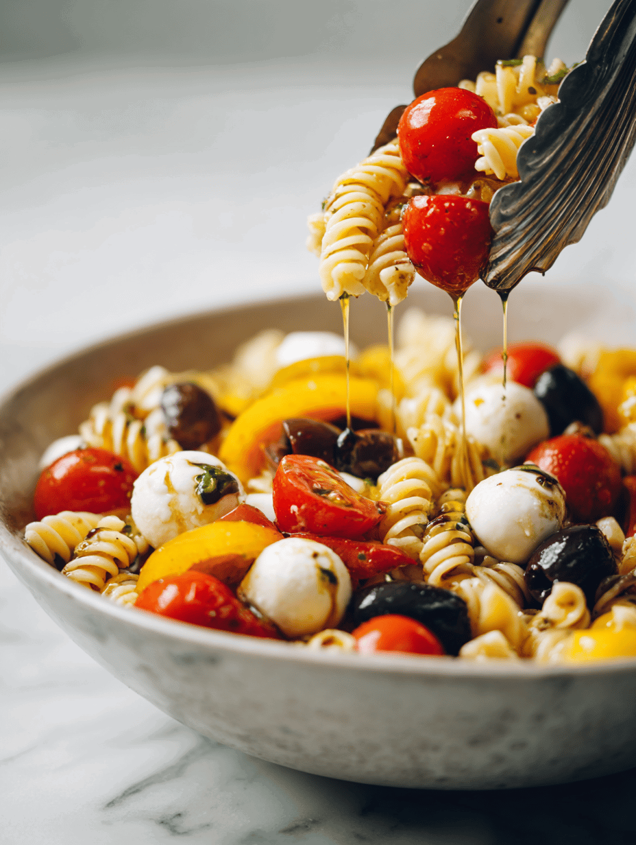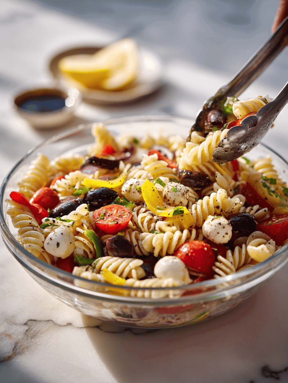 Step 4: Mix the dressing: whisk together olive oil, lemon juice, a pinch of garlic powder, and a splash of balsamic vinegar. Toss the cooled pasta with the dressing and vegetables until well coated.