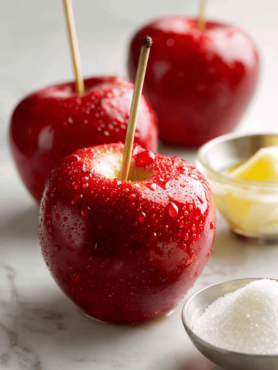 Step 1: Select firm, shiny apples—Granny Smith or Fuji work well—firm enough to hold the toffee without wobbling.