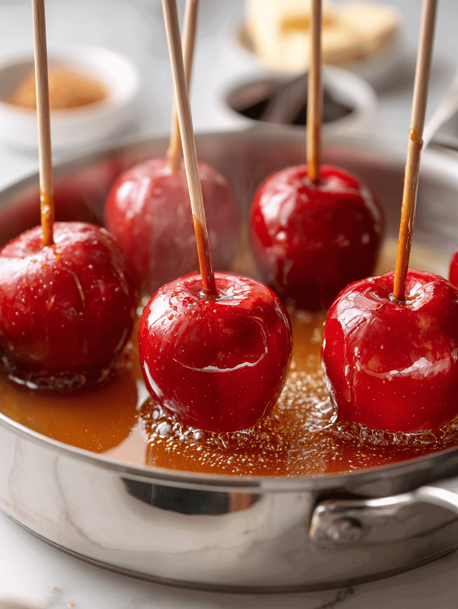 - Dip each apple into the hot toffee, tilting the pan to coat evenly and swirling gently to cover the entire surface. Let excess caramel drip back into the pan.