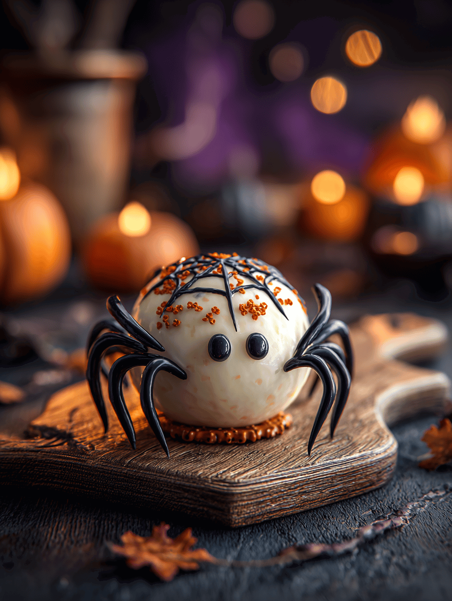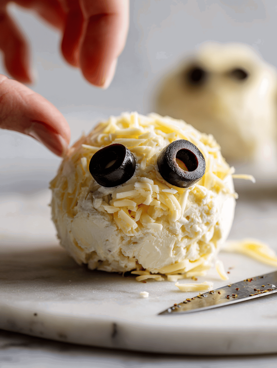 - Place black olives or cherry tomatoes on the cheese ball to create the spider’s eyes, pressing them gently into the surface for a flush fit.