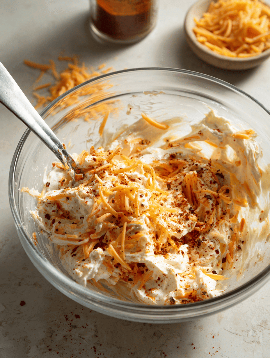 Step 1: Start with soft, room-temperature cream cheese so it’s easy to work with. Use a sturdy spoon or spatula to combine it with shredded cheddar, a pinch of garlic powder, and a dash of smoked paprika.