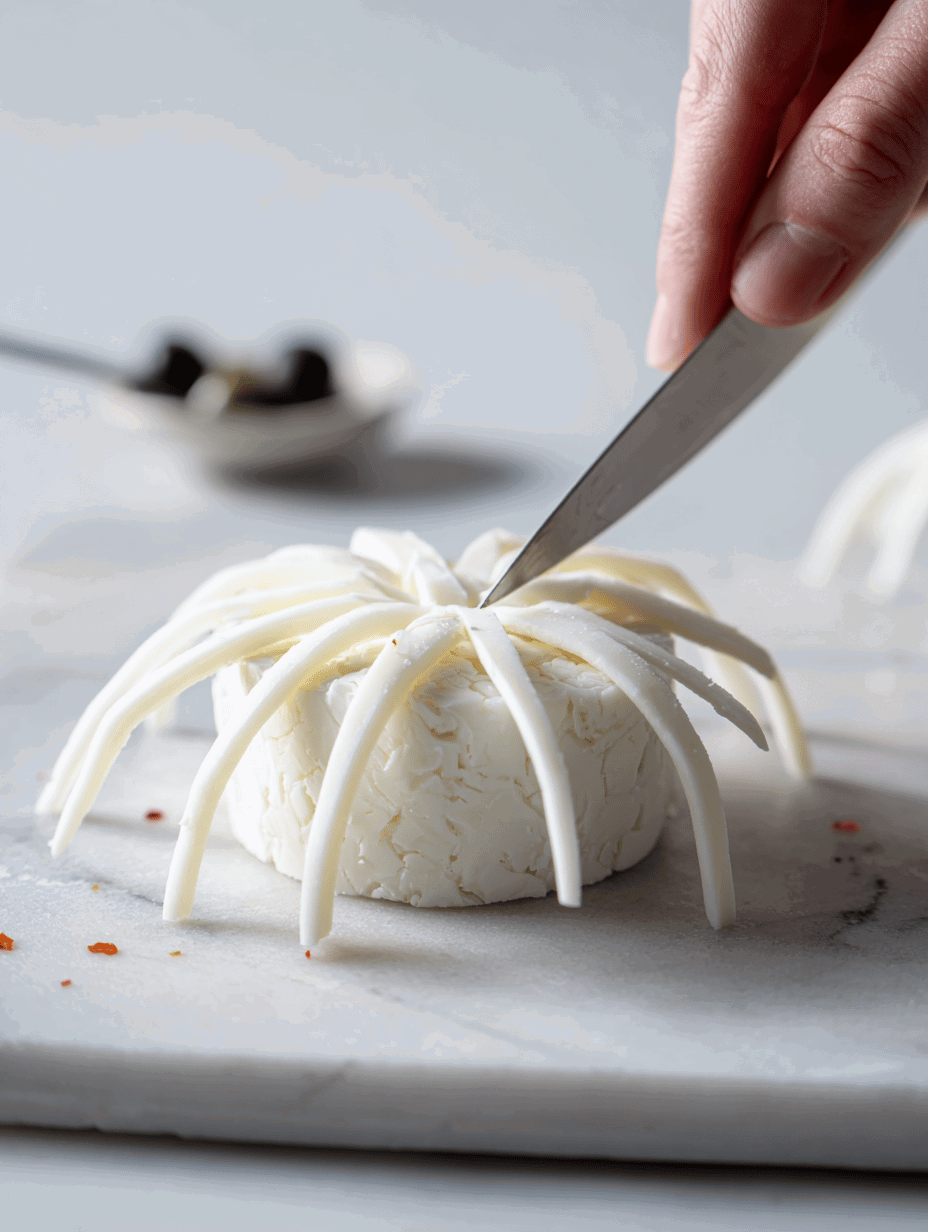 Step 3: For the legs, roll thin logs of string cheese or mozzarella. Attach them to the sides of the body with a dab of melted cheese or a toothpick, spreading out evenly to mimic spider legs.