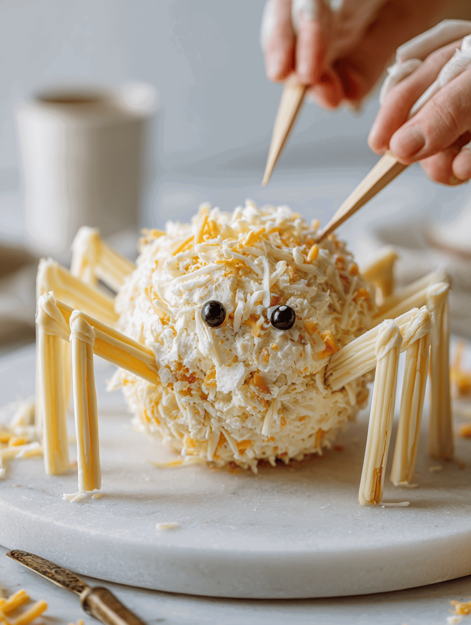 - Press the cheese logs onto the sides of the main cheese ball, spreading them out evenly to resemble spider legs. Use a small amount of melted cheese or a toothpick to secure each leg if needed.