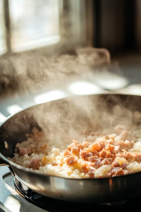 Stir in the garlic and diced ham, letting everything cook together for a minute to build flavor.