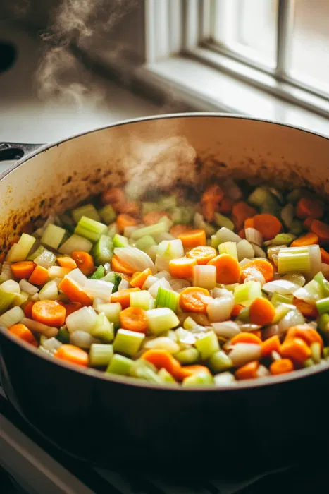 Add the onions, carrots, and celery, letting them soften for 5–7 minutes until they smell sweet and warm.