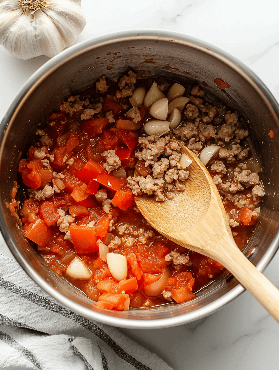 • Add the minced garlic to the pot and cook for another minute, stirring constantly until fragrant and slightly golden, releasing a warm, savory scent.