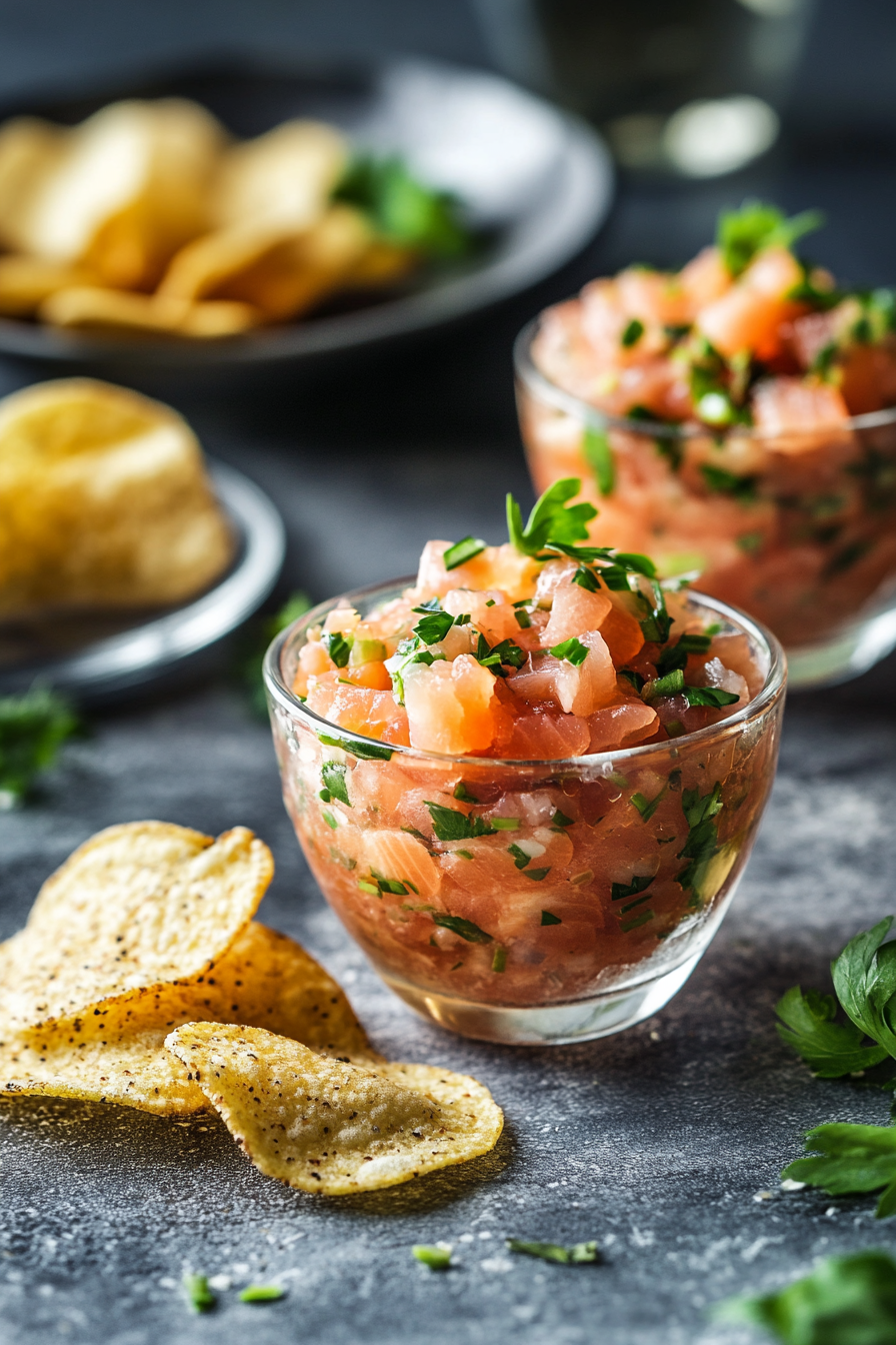 The velvety salmon, vibrant herbs, zesty citrus, and a touch of spice create a flavor-packed bite that’s both fresh and indulgent. Pair it with crispy, golden chips, and you’ve got a dish that’s effortlessly impressive.