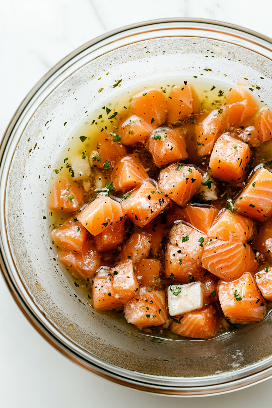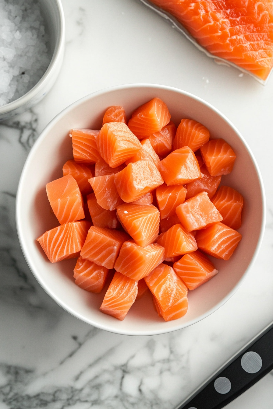 - Cut the salmon into small ¼-inch cubes and refrigerate to keep it cold.