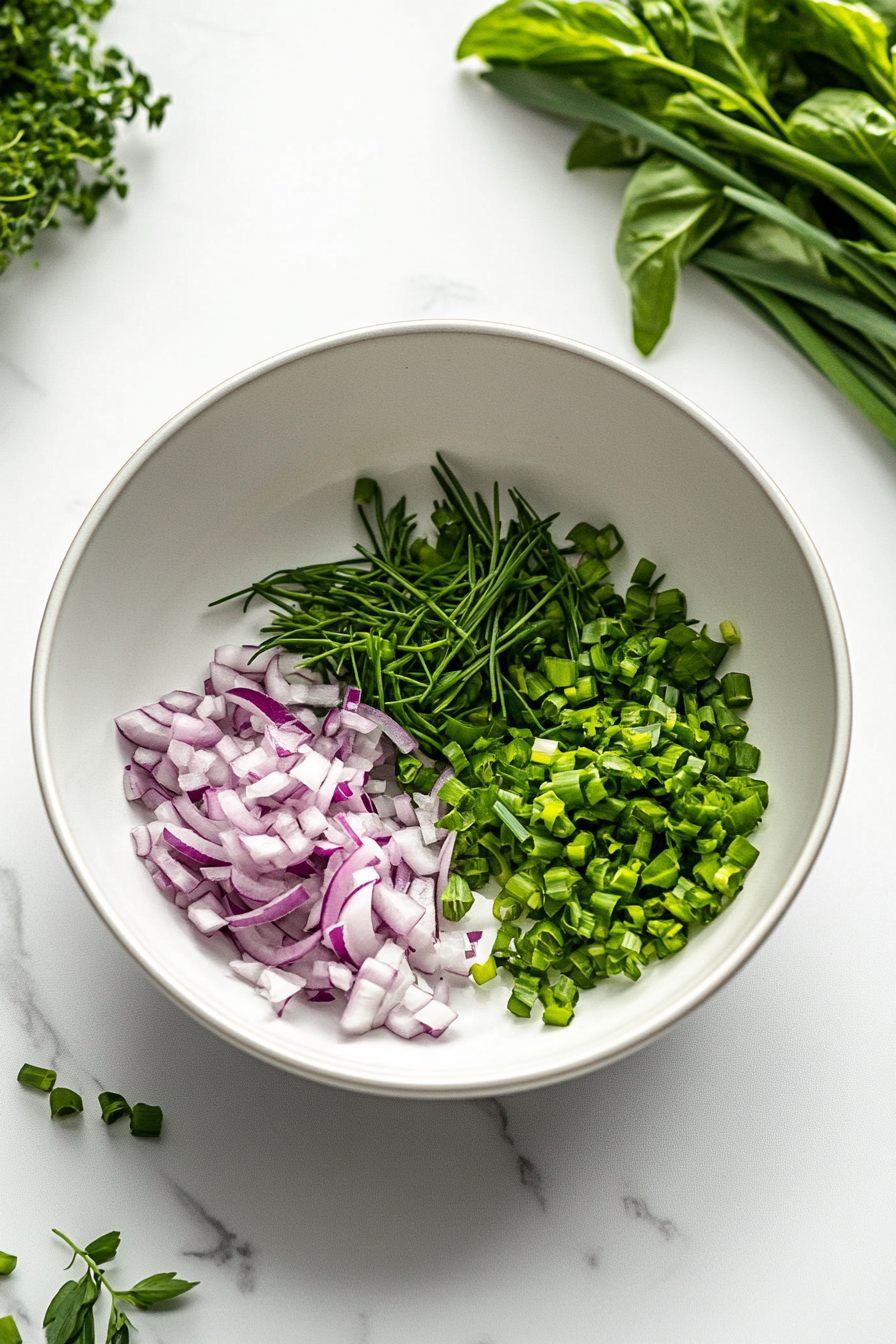 - In a small bowl, mix the chives, basil, red onion, capers, and green onions.