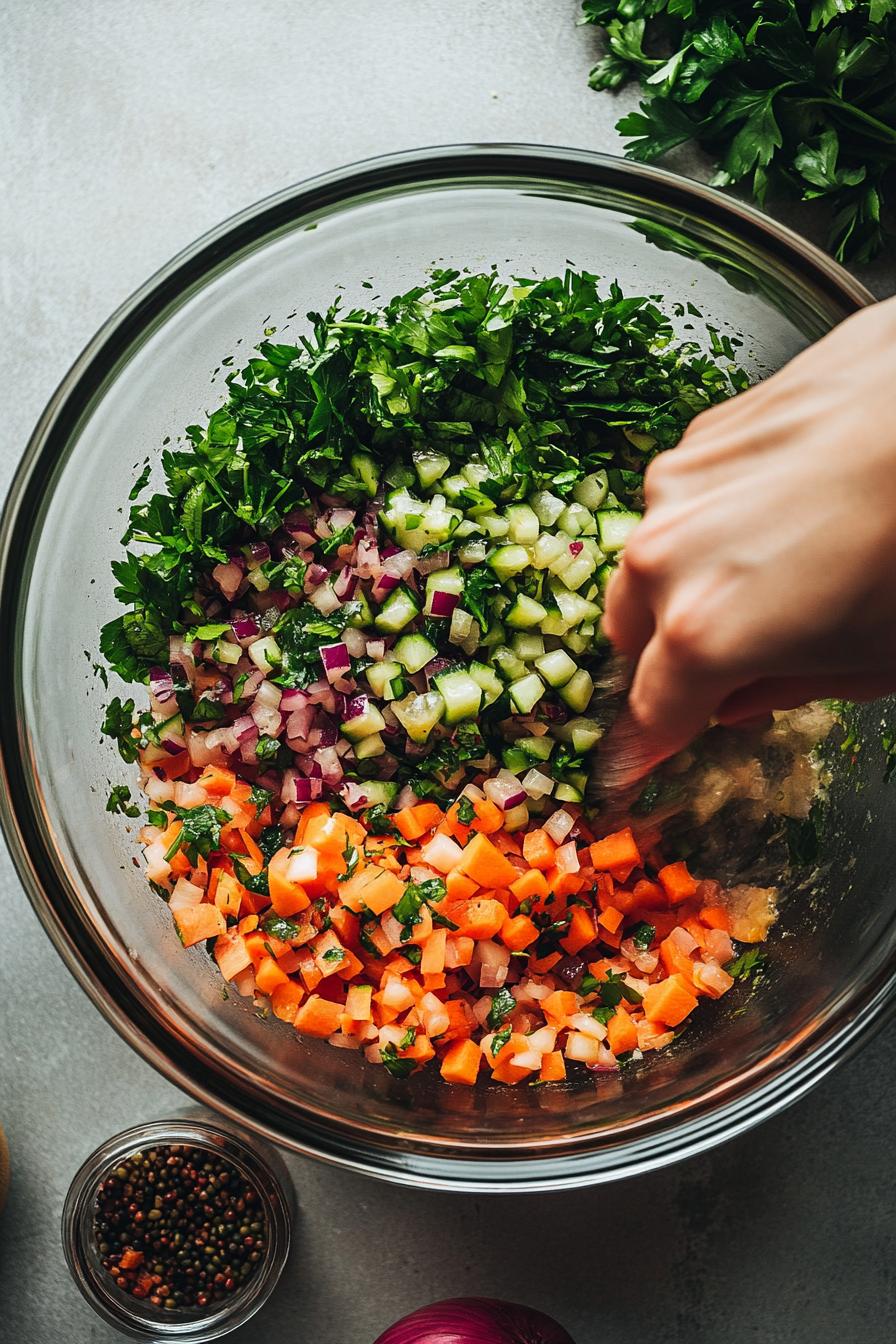 - Add the herbs and vegetables to the vinaigrette and stir until combined.