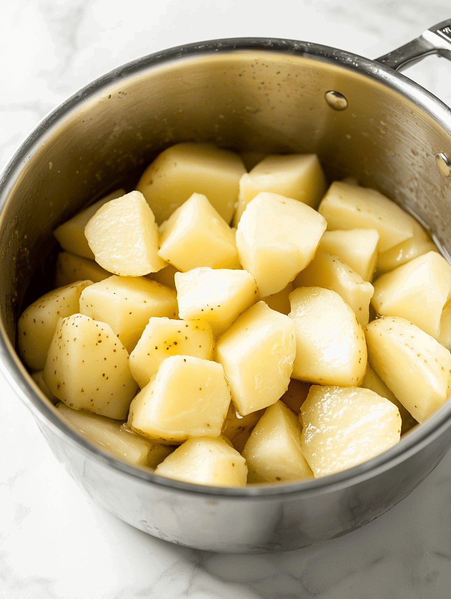 • Peel and chop the potatoes into even chunks, then place them in a large pot and cover with cold water. Bring to a boil and cook until the potatoes are fork-tender, about 15 minutes.
